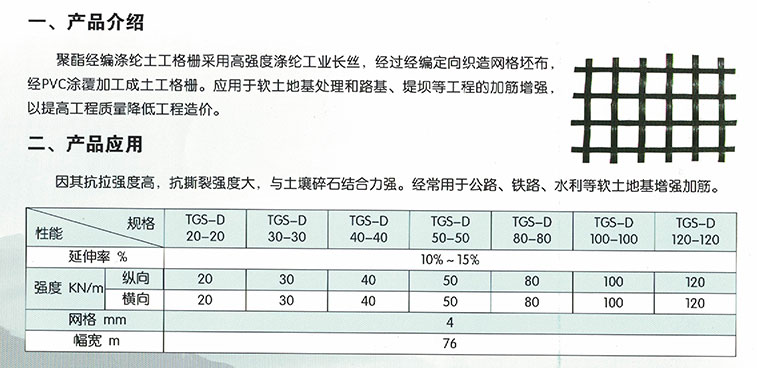 聚酯經(jīng)編滌綸土工格柵采用高強度滌綸工業(yè)長絲,經(jīng)過經(jīng)編定向織造網(wǎng)格坯布,經(jīng)PVC涂覆加工成土工格柵。應(yīng)用于軟土地基處理和路基、堤壩等工程的加筋增強,以提高工程質(zhì)量降低工程造價。